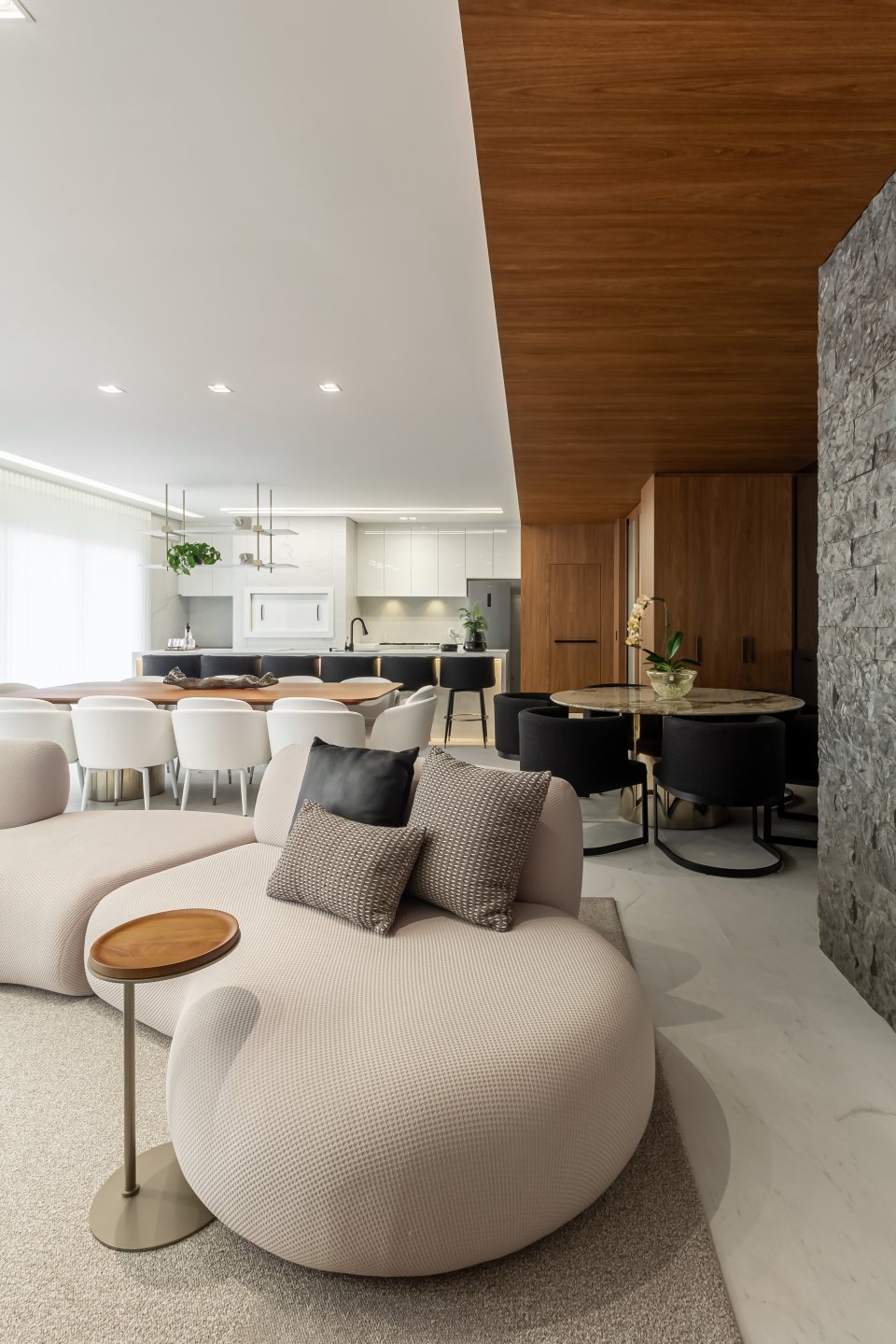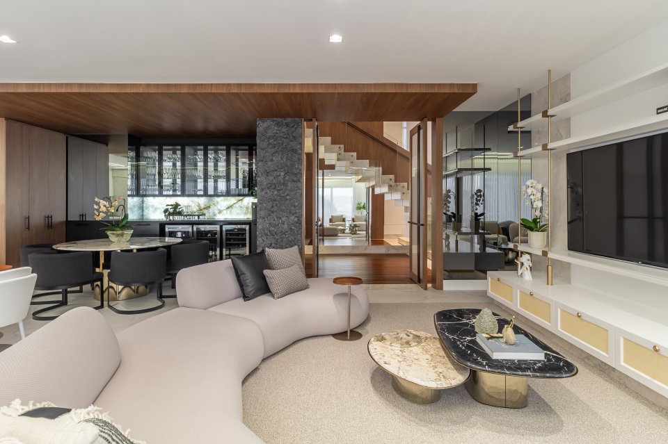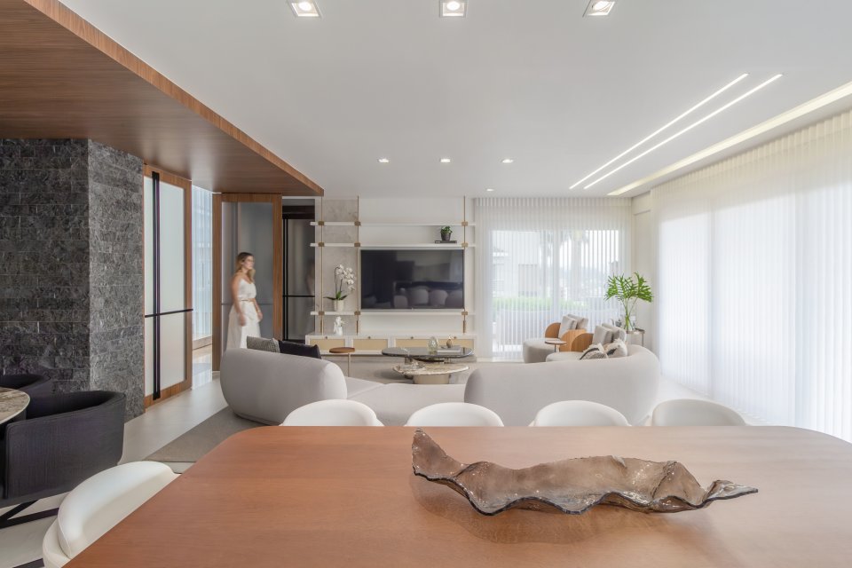 O ambiente foi concebido para ser versátil e atemporal, acolhendo tanto os momentos íntimos em família quanto celebrações com amigos. A disposição fluida dos móveis, a escolha dos materiais e a integração visual com o entorno favorecem a circulação e o bem-estar, respeitando a individualidade de cada uso sem comprometer o conjunto
