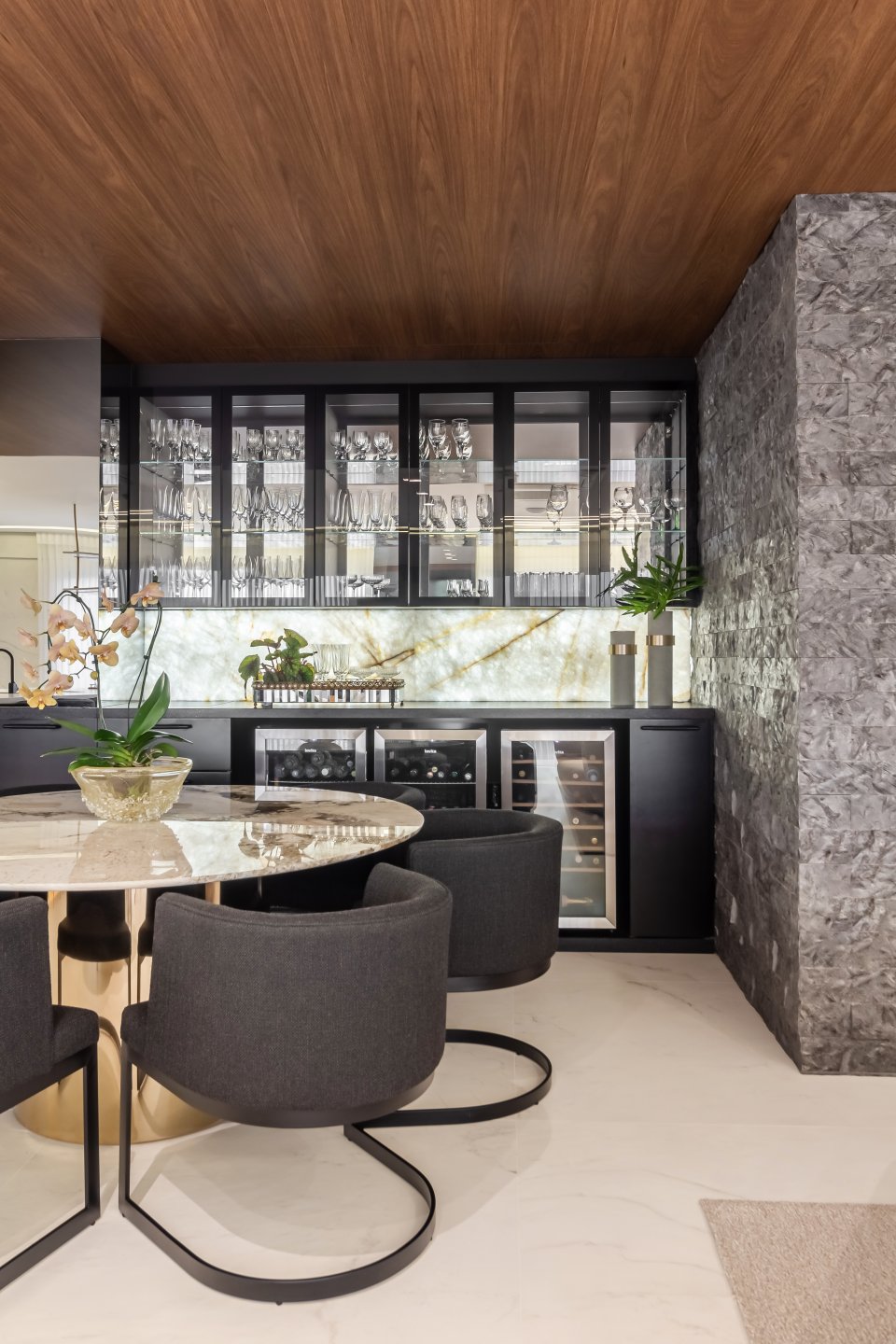 A linguagem adotada valoriza texturas naturais e acabamentos elegantes. Mármore retroiluminado, pedra Nero natural, marcenaria em lâmina escura e espelhos no tom fumê compõem uma paleta sofisticada e aconchegante. A ala de bebidas com estrutura completa, eleva a experiência sensorial do espaço, destacando também a redonda com tampo em pedra natural exclusiva, que simboliza o ponto de convergência do pro
